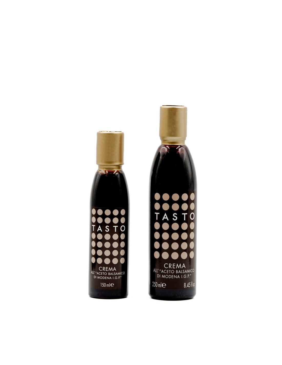 La Crema Tasto All'Aceto Balsamico di Modena IGP è un condimento denso e ricco con il perfetto equilibrio tra dolcezza e acidità. Ideale per decorare piatti gourmet, insalate e per accompagnare formaggi. Confezioni da 150 ml, 250 ml e 500 ml.